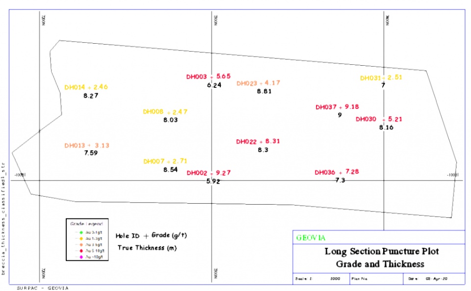 Creating a plot with the hole ID, Thickness and Grade for each puncture point.