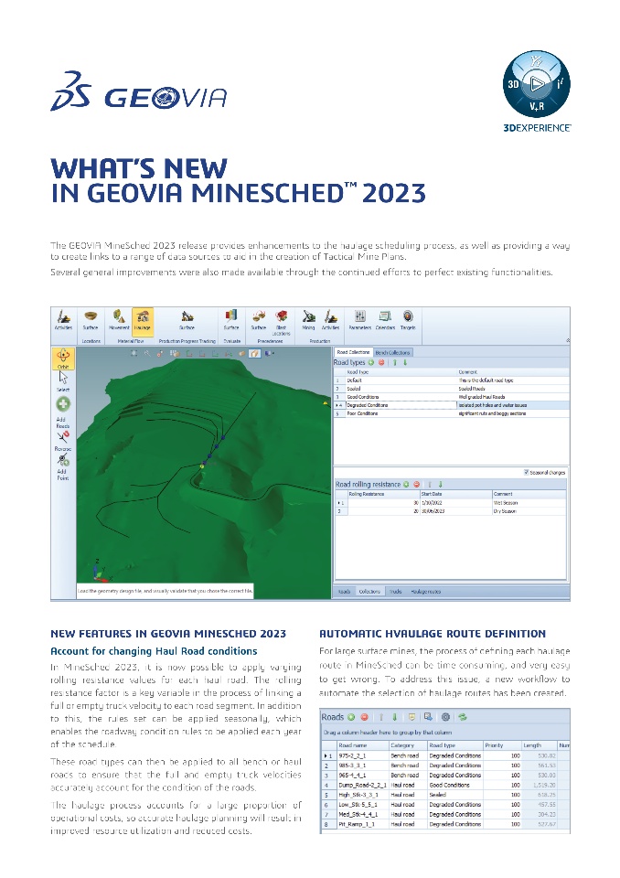 The GEOVIA MineSched 2023 release provides enhancements to the haulage scheduling process, as well as providing a way to create links to a range of data sources to aid in creating Tactical Mine Plans. Several general improvements were also made available through the continued efforts to perfect existing functionalities.