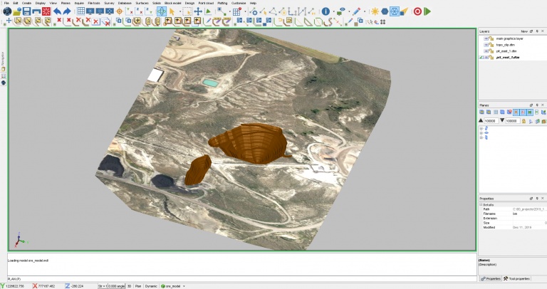 STEP 4: In Surpac, open any additional data to supplement the animations like surfaces, solids, or drill-holes. In my example, I am using an aerial photo draped onto the topography surface, and two pit designs.