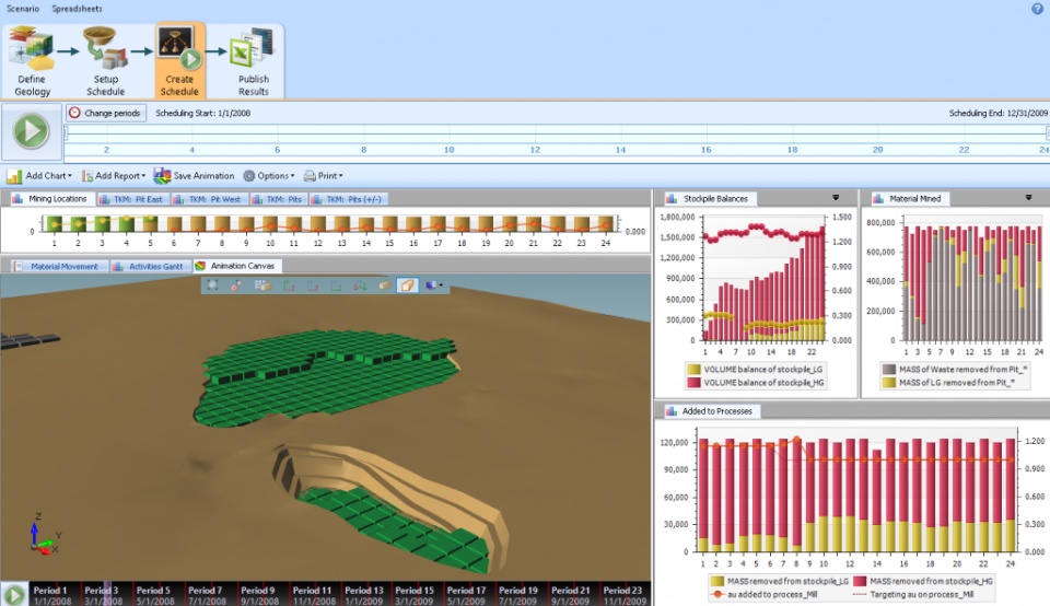 It is possible though if we consider two factors: First, the definition of materials into the schedule comes from the block model, and second, we can export the results of the schedule back into the block model. This means however, that the schedule animation will be happening in Surpac.