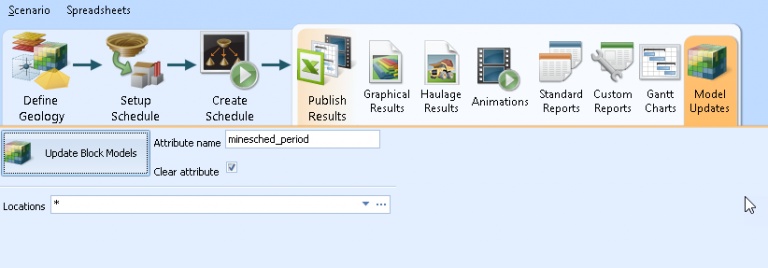 STEP 2: In the Publish Results ribbon choose the Model Updates tab. You can select a name for the new attribute it will create in the block model, or use the default minesched_period. Make sure option for Clear attribute is checked on, this will eliminate any risk of combining the results of multiple exports to the block model. Hit the button to Update Block Models.