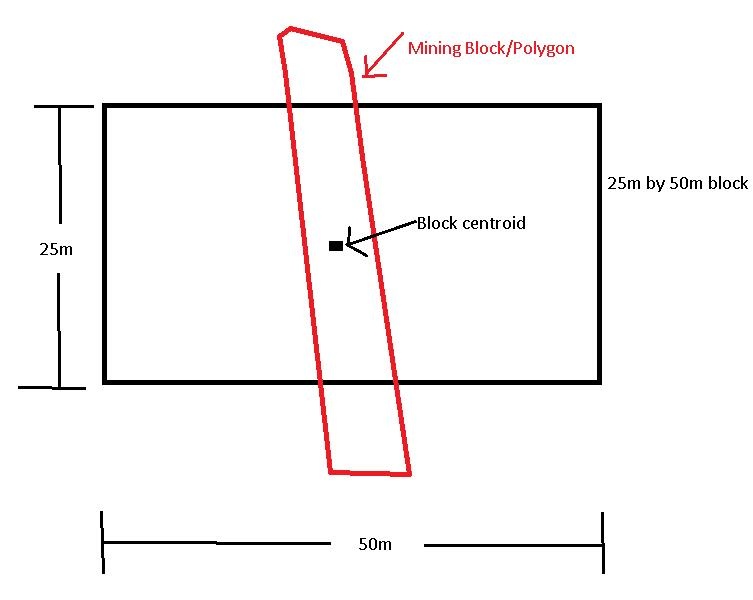 This is because the centroid of the block model block is inside the mining block. This leads to an overestimation of what is available for mining. The reverse is true when the centroid is sitting outside the mining block, there will be underestimation of material available material (Figure 2)