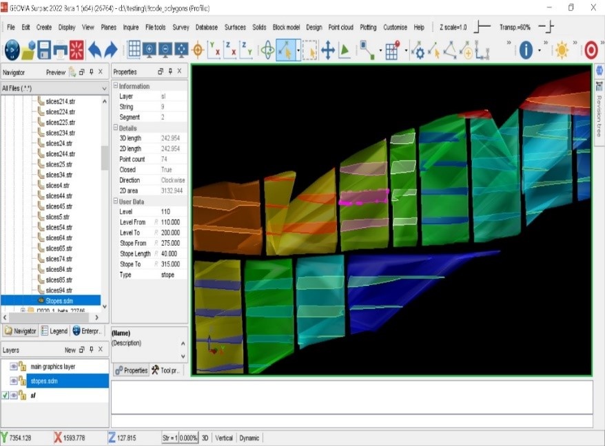 With the improved SDM file functionalities, Surpac 2022 users can slice objects, centre line slice, and solid slicer, maintaining the metadata in their respective output segments. This allows data from coded trisolations to be transferred to slice polygons for display or plotting purposes.