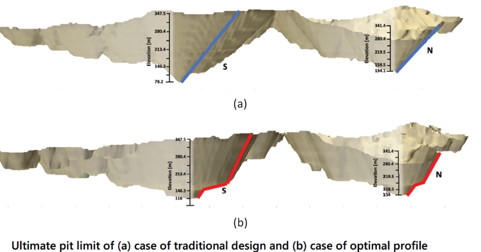 The overall slope angle (OSA) of pit walls plays a crucial role in the financial return of open pit mines. The paper showcases a novel design methodology where non-planar geotechnically optimal pit walls with an OSA steeper than what is used in current design practices are employed without compromising mine safety, i.e. the optimal profiles are featured by the same Factor of Safety (FoS) than their traditional design counterparts.
