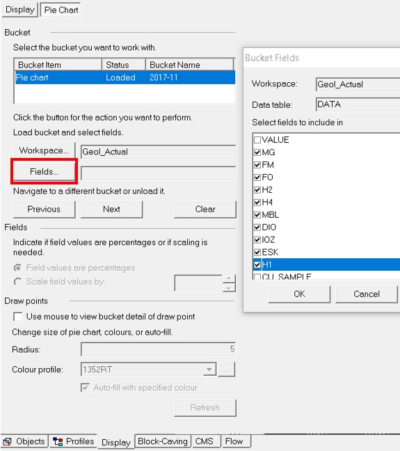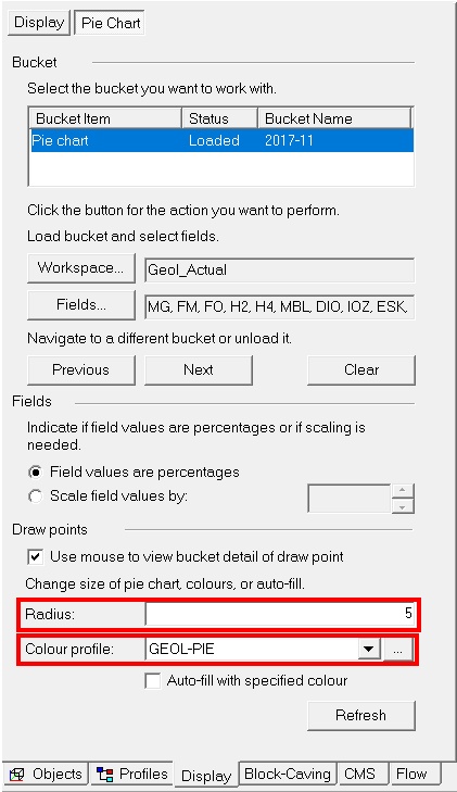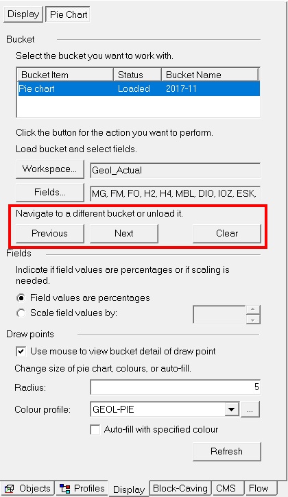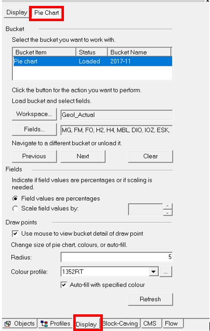 First, make sure that the rock types within the bucket add up to 100% for the pie chart display to work.