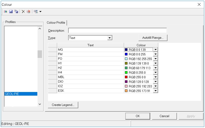 Setup the colour profile for the rock types by selecting Profile>Other Profiles> Colour.