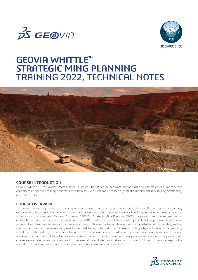 Dassault Systèmes GEOVIA’s Strategic Mine Planning (SMP) is a professional course designed to enable Mining and Geology professionals with all SMP capabilities critical for de-risking and holistic optimization of mining projects.