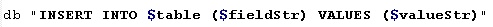 STEP 6. Using the database handle (db) we can give instructions to the database. Here we are passing the variables for the table and the text strings for the field names and values.