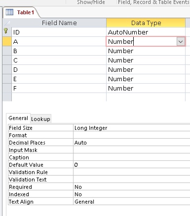 For the simple purposes of this example I have an access database saved as: C:/00_projects/GEOVIA_blog/database1.accdb. The database has a table called Table1 with six fields (A, B, C, D, E, and F) all prepared to accept some integer values.