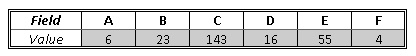 Here the plan is to create a row in the database where order of the the values in the two lists map the fields to their values. The macro will create a row in the with values in the following table. I have purposefully jumbled the order of the fields in the lists to show that the order of the fields is not important. What is important is matching the sequence of values with the sequence of field names.
