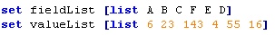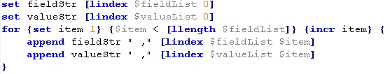 An easy way to transform these list into the text strings is to use the lindex and append commands and a for loop. Here we will store the values from the lists in two variables, fieldStr and valueStr.