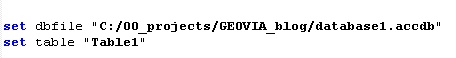 STEP 2. There are some options for how we want to input the database and table for the macro. They could be specified directly as part of the command, but my preference is to pass these values as a variable. This could be done with a custom GUIDO form but, to keep this example simple we will simply use the set command to prepare all variables.