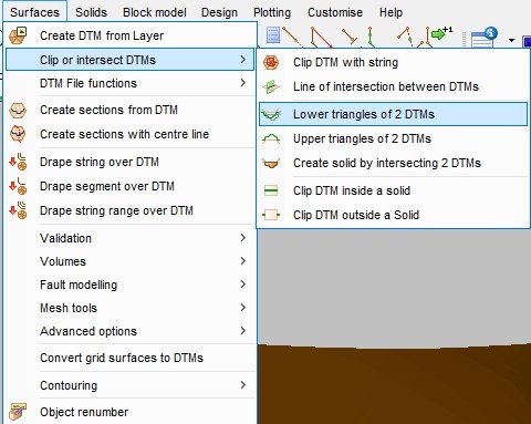 From the Surfaces menu, select Clip or intersect DTMs > Lower triangles of 2 DTMs