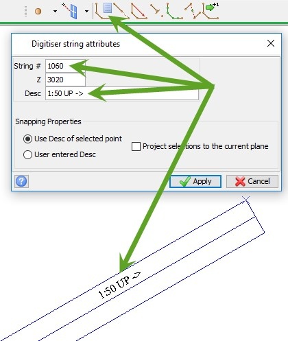 As you can see from the above example, all text is at a 90 degree bearing. This is because you can only have one text orientation per string number in Surpac.