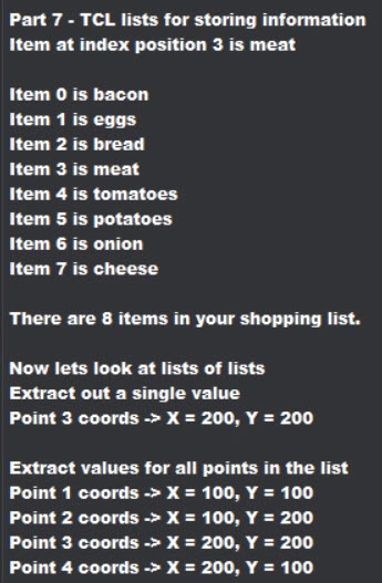 puts "" puts "Part 7 - TCL lists for storing information"