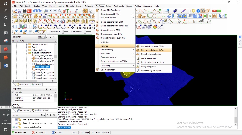 To calculate the volume, go to Surface →Volumes → Net volume between DTMs