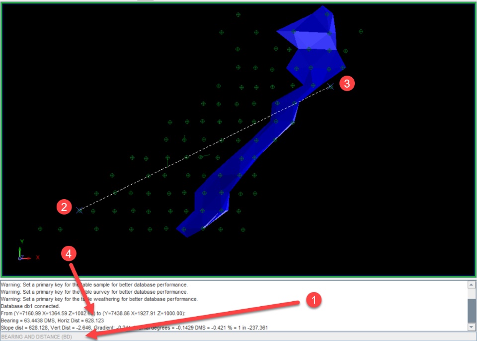 - Open up the data and measure the distance the oblique sections are to cover. This function can be activated by typing in BD into the function line.