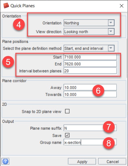 - Select the orientation. In this example, we are selecting Northing, but Easting and Elevation can also be selected. (Oblique sections will be covered in the next section)