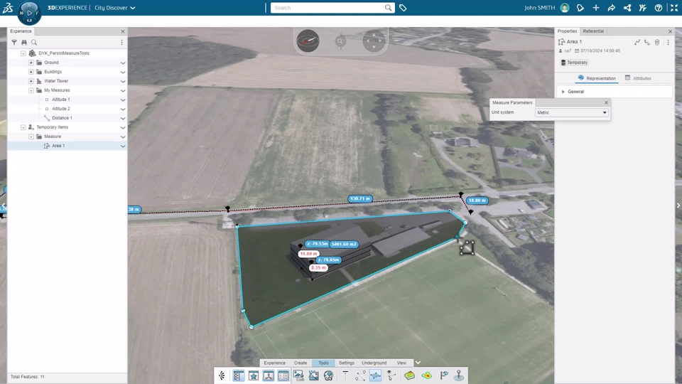 You are already familiar with making measurements within the virtual twin of your territory (height, distance, horizontal plane area). By default, these measurements are generated in the “Temporary items” group, where all items are transient and will not be retained after a refresh.