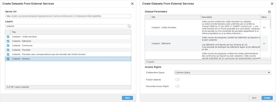 Effortlessly create multiple datasets from external services like WFS, WMS, and WMTS directly within City Referential, significantly accelerating your workflow.
