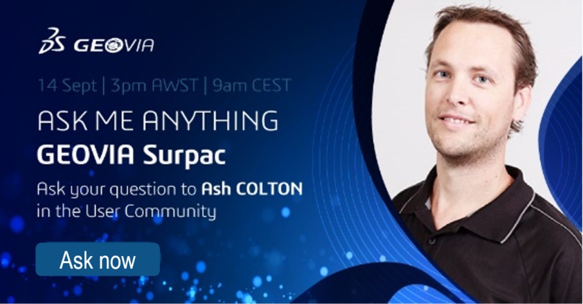 For this first session Ash COLTON, our Surpac expert, will answer your questions to help you maximize the use of your software. Make sure your questions are on the agenda: post them before Monday 13 September, 12am.