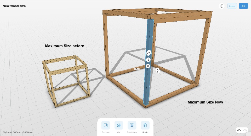 All feedback we’ve had is the custom wood size was a great addition. Some users however are looking for longer boards or larger profiles. We listened and have increased the sizing to 300x300x7000mm.