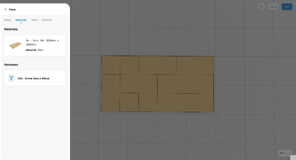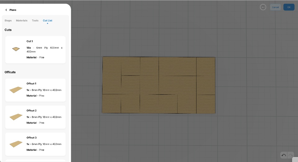 When using plywood you want to avoid buying too much that will result in unnecessary waste. We’ve enhanced the algorithm using a 2D layout packing approach, which fits the cut list material to size using stock plywood sheet.