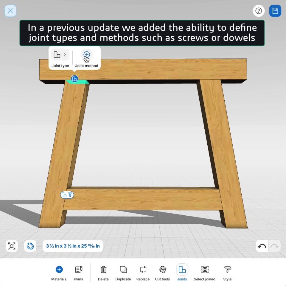 We've had joints since day one, but up until now if you selected lumber that was screwed to another bit of lumber it would behave no different. It wouldn't select, it wouldn't drag - well it was a drag that it didn't behave realistically as it would in real life. Screw something to something else it should behave like its joined. In 3.0 that's exactly how things now work