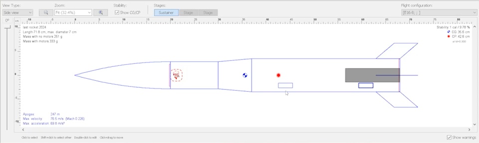 What it reveals is the location of the rocket's center of mass (the point where you can balance it on one finger) and its center of pressure (the point where all of the aerodynamic forces are balanced). In general, you want the center of mass in front of the center of pressure and ideally, the distance between the two should be between 1 and 2 times the diameter of the rocket. Achieving this ratio is the key to a rocket's stability.