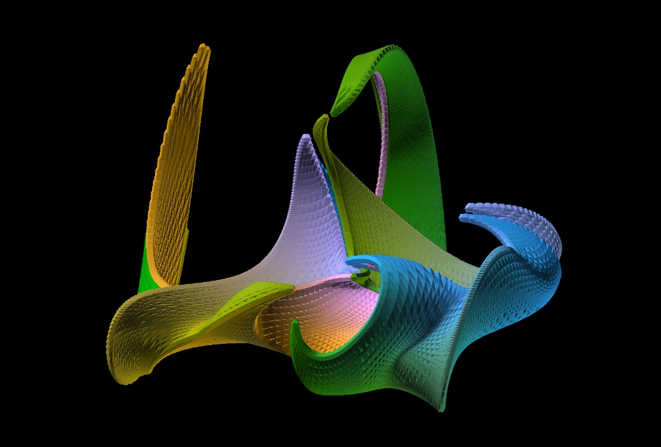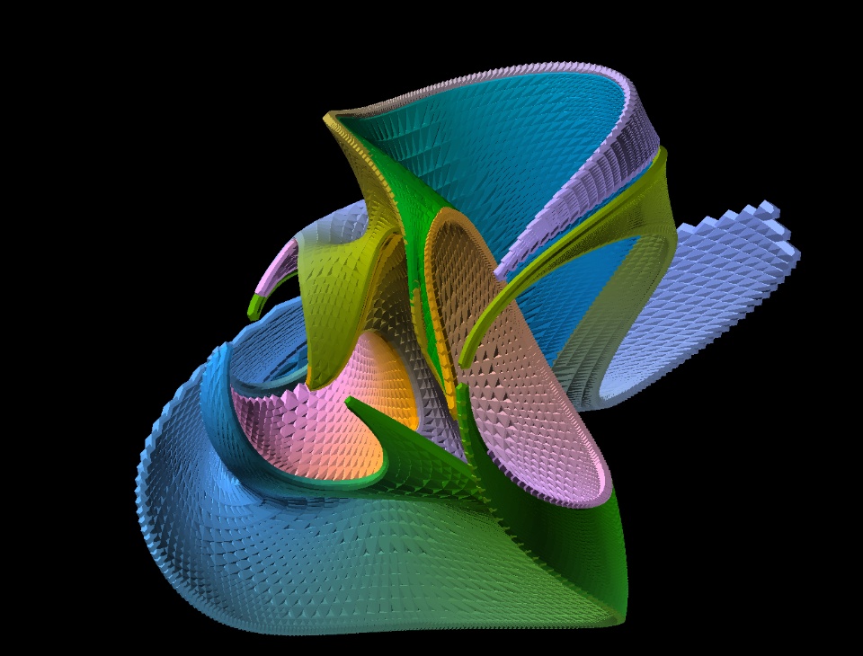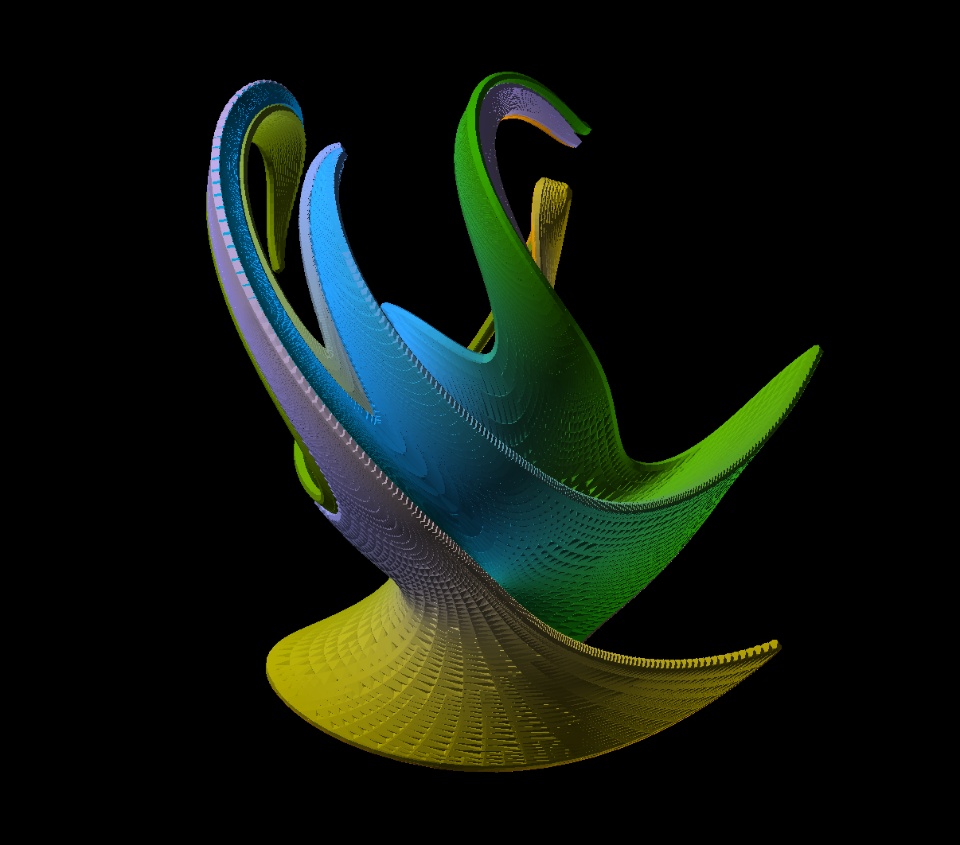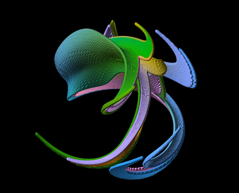 Each of the images below is a rendering of one 3D model constructd with sequential transformations of a cube. Each of the eight arms or tentacles was originally a corner of the cube which has been elongated and twisted by the coordinate transformation operations.