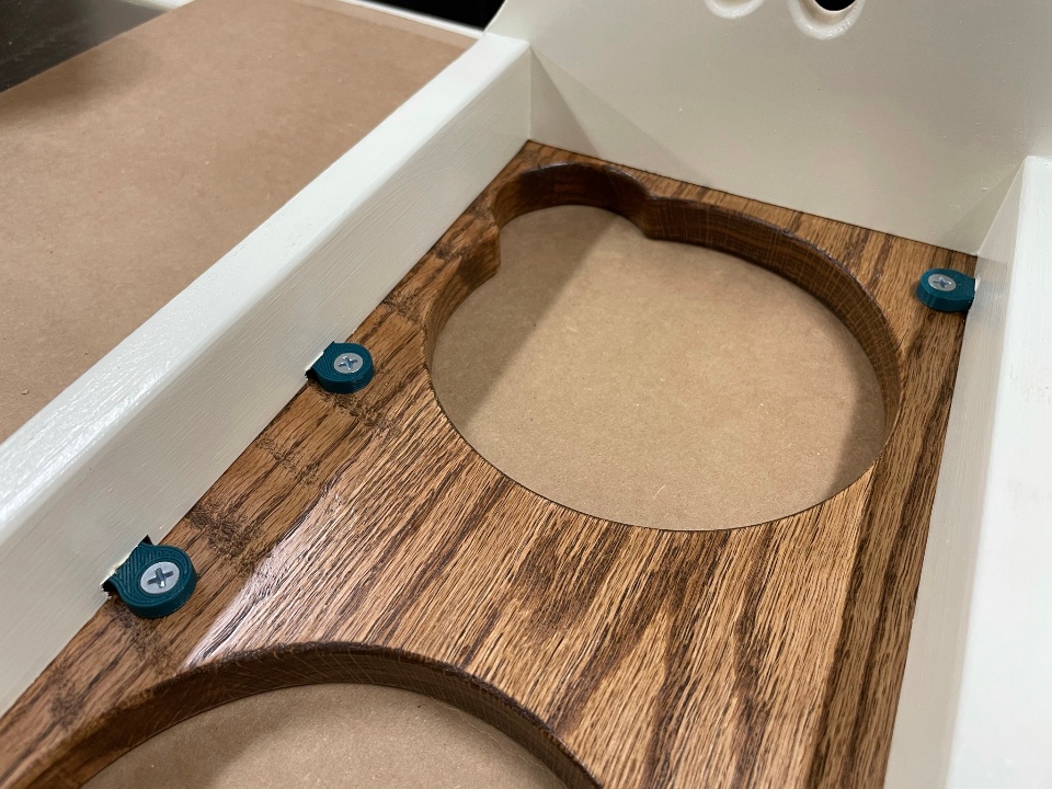 With the top and frame inverted and properly positioned, I could locate the holes, predrill, and then attach the screws!