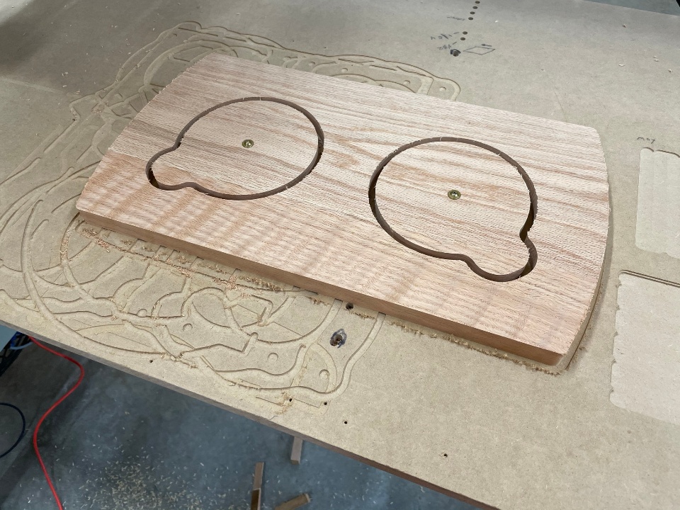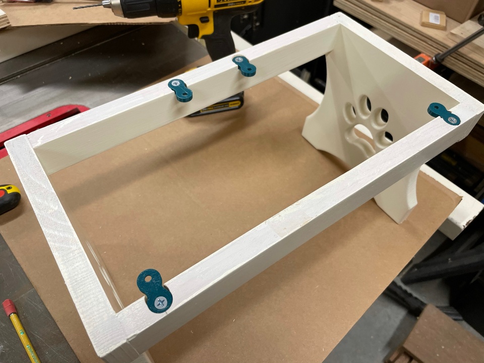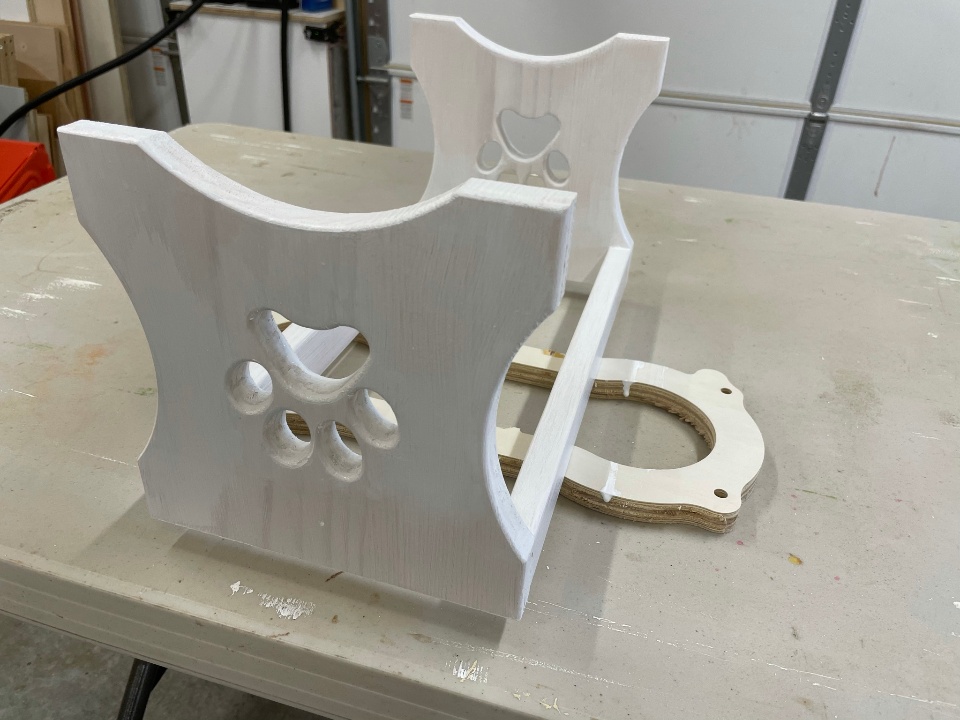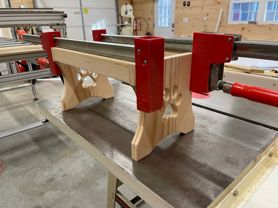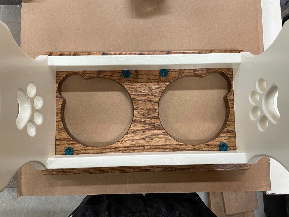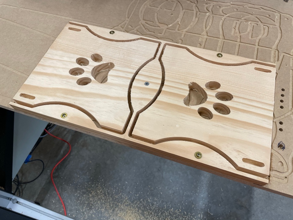 I turned to my CNC to make short work of cutting out the intricate pawprint design and the holes in the top, but used my good old table saw to fabricate the stretchers.