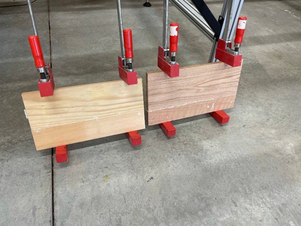 I started by gluing up a few pine boards for the painted legs, and some red oak boards for the top.
