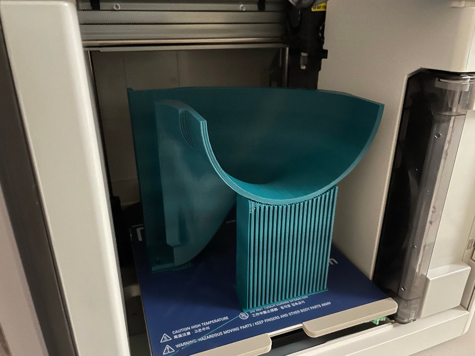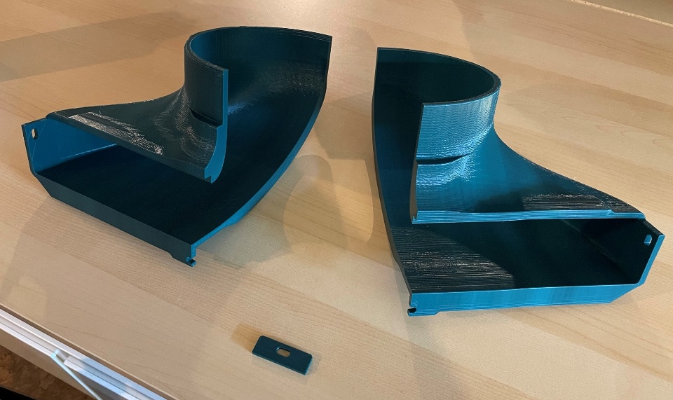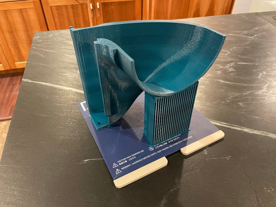 In the end the design was too large to be printed in one piece (at least on the printer I had access to at the time), so I split the design into two main pieces and printed them on a Sindoh 3DWOX1. I took care to design and orient the parts in such a way as to ensure the inner surfaces of the hood would be as smooth as possible.