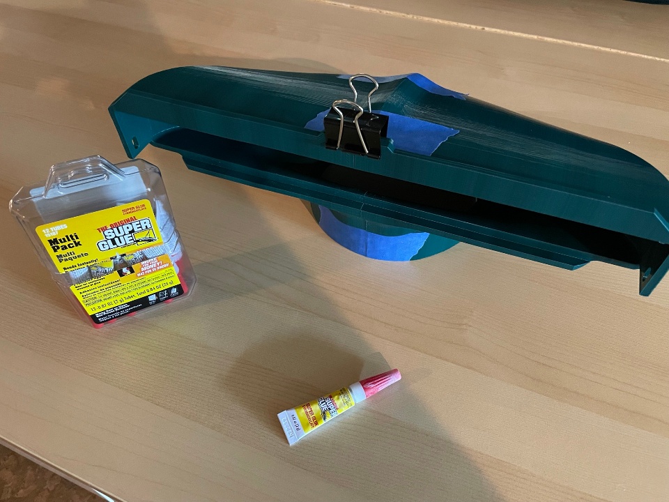 With all the parts printed, I could glue them together using good 'ole super glue! I also used blue painters tape and a clip as clamps while the glue set up.