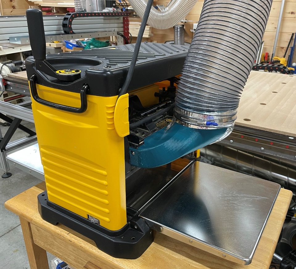 Finally, I attached the hood to the planer and then connected it to the branch using a short section of flex hose. This allows for the planer to be raised and lowered without issue.