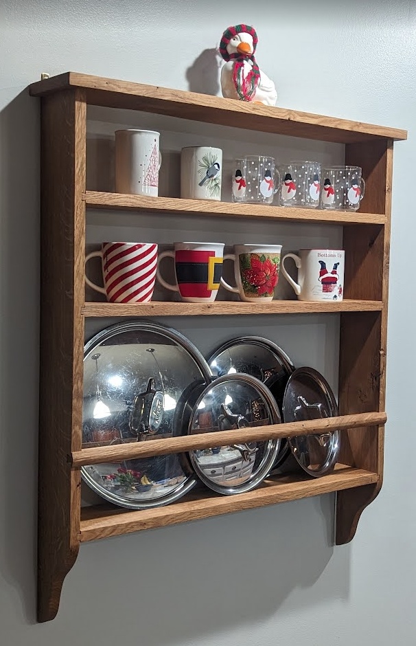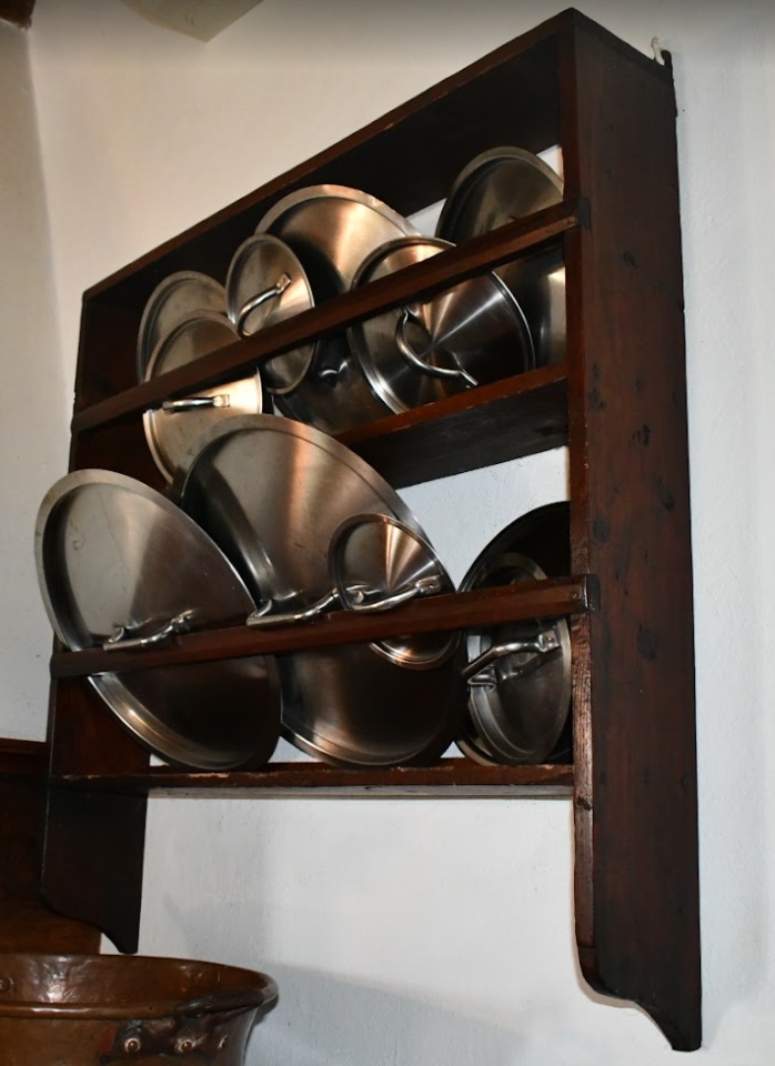 A kitchen with a shelf, on which lids were meant.