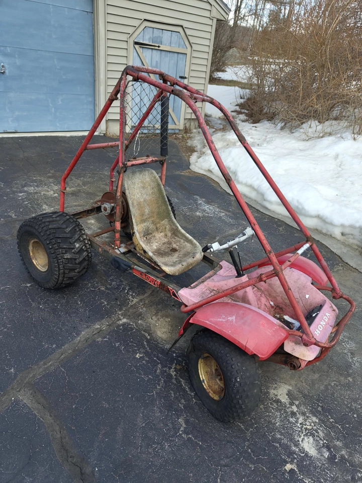 I had never built a go-kart before, and decided the time was now. My first forays into research were like drinking from a firehose. There were so many decisions to make, from kingpin angle and wheel size to center of gravity and ackermann steering geometry. Due to this deluge of information, I decided to start with a few more "known goods", I would take a kart that already existed, and convert it to accept the 15 HP electric motor that I had scrounged from a BattleBots competitor, Valkyrie. After more research, I chose the Honda FL250 "Odyssey". More specifically, I chose this one: