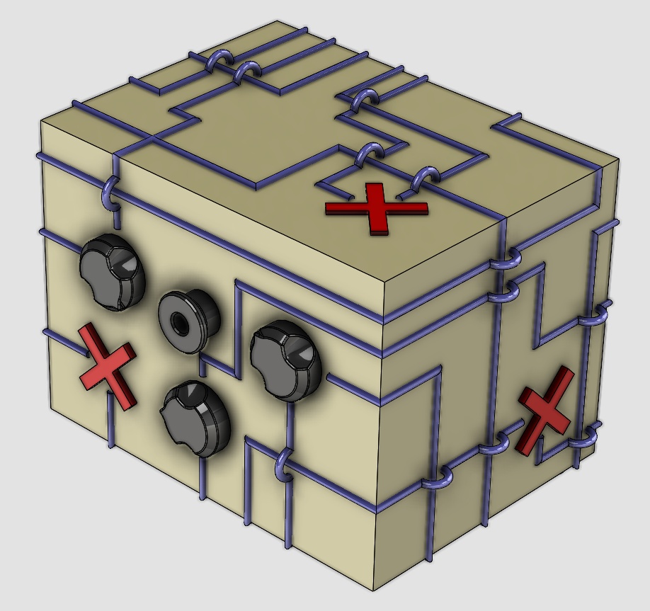 This time, we moved the controls to the front of the box and made 100% of the mehanism 3D Printable. It still uses the two piece dial design that has a back piece which can be indexed in any one of 8 positions. This allows for a total of 512 unique possible combinations, so you may be wondering how we consider this puzzle box 'infinitely' customizable.