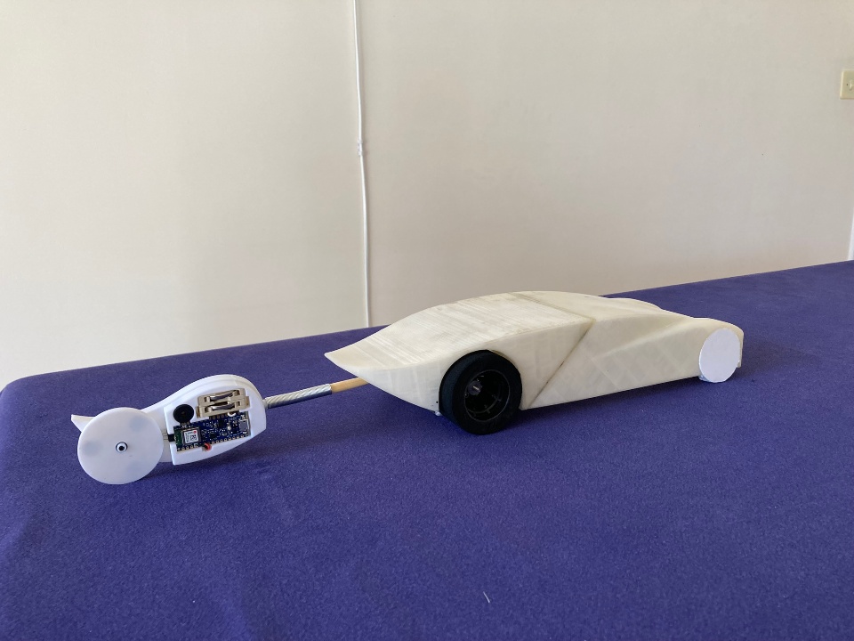 We had a brainstorm at the beginning of the project, about what devices could bring extra value to the project, and Louis suggested that we have some way of measuring the speed & acceleration of the car, in order to compare different tyre materials as this is a straight-line, dragster style race and we have to design our own wheels and tyres. And he suggested we do it with magnets on a wheel, like a bicycle speedometer. In order to keep this from compromising the car design, we decided to make it into a trailer that can be installed for testing and removed for racing, and make it autonomous with a radio link to a tablet or phone.