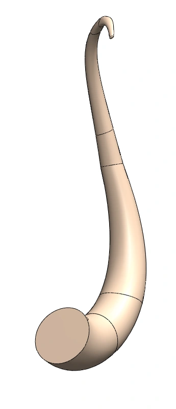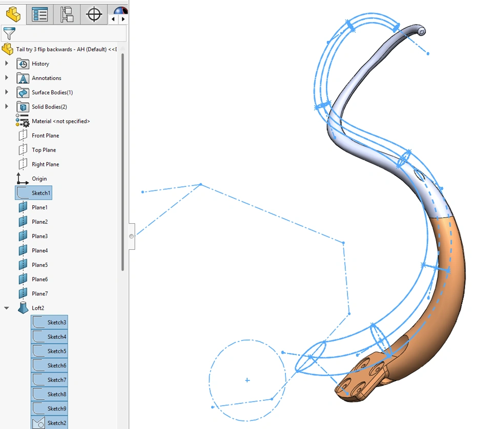 The final modeling strategy was a structured loft with many controlled cross sections and guide curves, then 3 flex features to bend it into the desired shape.