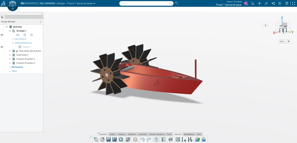 For my first project, I decided to start with a simple and elegant design of a “Boat toy” which works on the rubber band mechanism. My goal was to create something simple but functional for my kid, which would also help me understand SolidWorks' basic tools and features to start with.