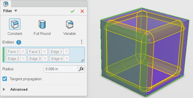 The final embellishments are equally easy to add. Whether they choose to break the edges with a fillet or a chamfer, the inputs are the same: select some edges, and input a value!
