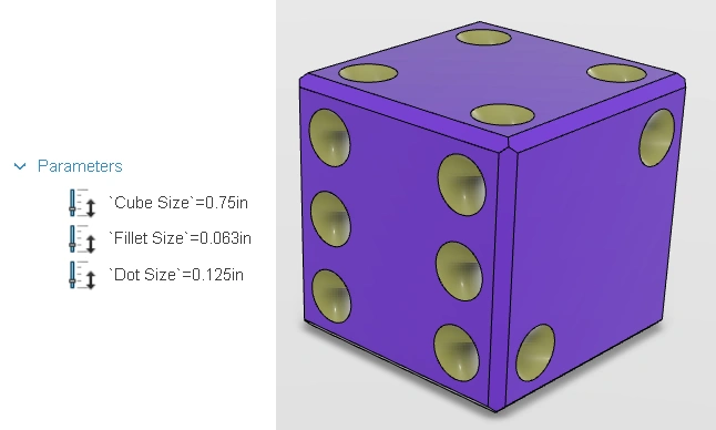 I added a bit more 'smarts' to the model I've shared below, taking care with my sketch constraints and adding a few parameters so a new maker can first adjust a few values and create the die they prefer.