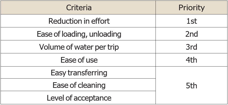 1. Should allow to carry 45 liters of water in 1-2 trips
