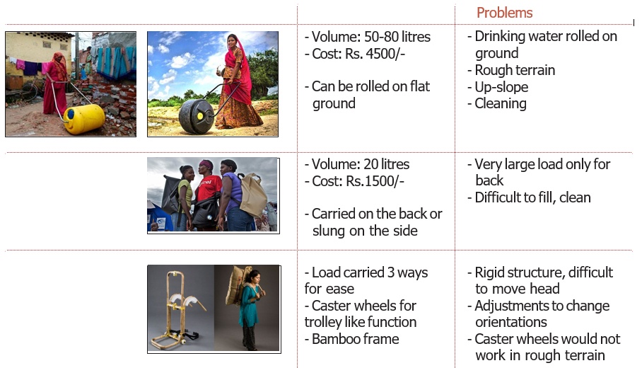 Access to potable water in villages is still a problem in India. It has to be fetched from long distances. This task is usually done by the women in the family. They go to fetch water from the well or a pump in the area. This constitutes approximately 50 litres of water per day for a family of 5 members. The most common method of fetching water is by carrying matkas/handas on the head. This form of head load causes a lot of strain on the neck and often is the cause of injuries and muscular spasms.