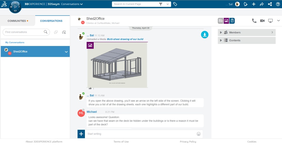 ...and we had a private conversation with my brother right here in the MadeIn3D SWYM community where we exchanged text, images, 3D models, and 2D Drawings. My brother simply created a free 3DExperience account, and with nothing to install, was able to collaborate, and see our ideas in 3D right on his phone! It was awesome!