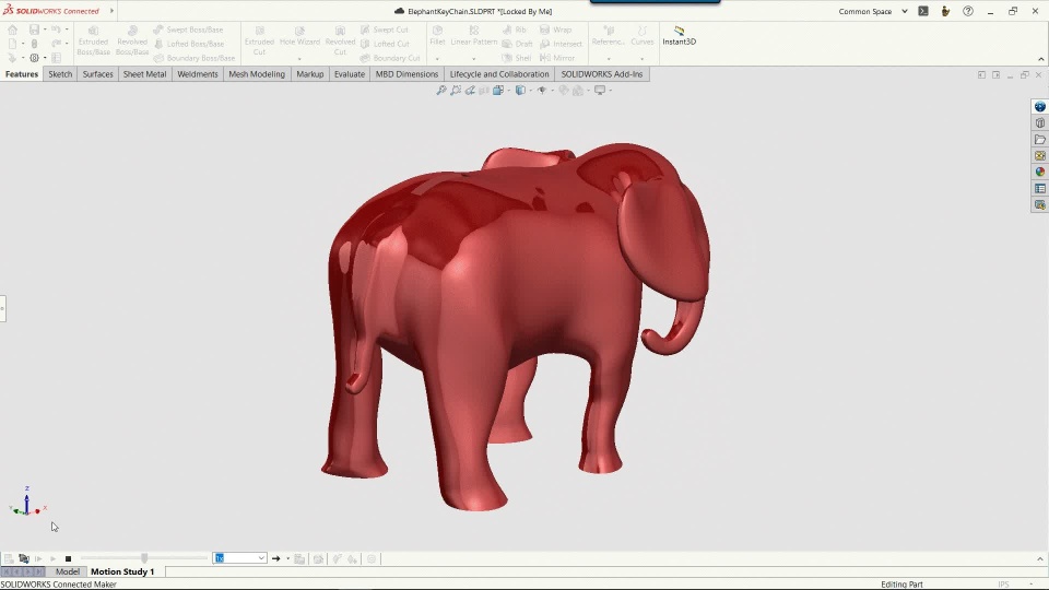 From there, I saved an STL of the elephant and brought it into SOLIDWORKS so I could add features and turn it into a 'keychain'.