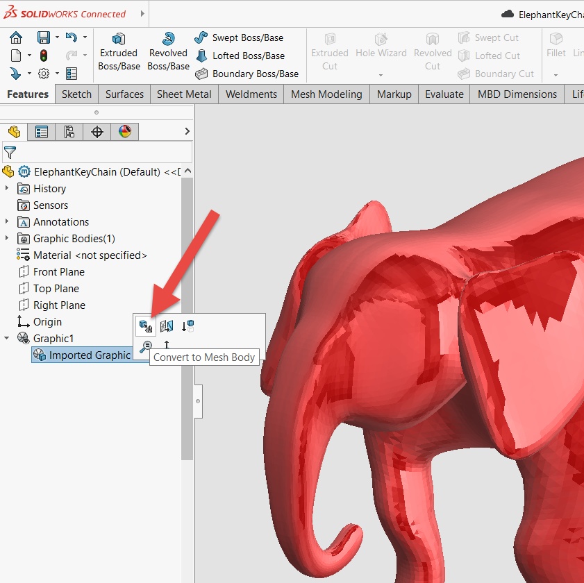 Did you know that SOLIDWORKS has been steadily improving its ability to work with mesh data? It's really awesome and now you can basically work with mesh data just like you do other solid geometry. Large mesh files come in as graphics bodies, but you can easily elect to convert them into 'mesh solids' so you can add material to or remove material from them.