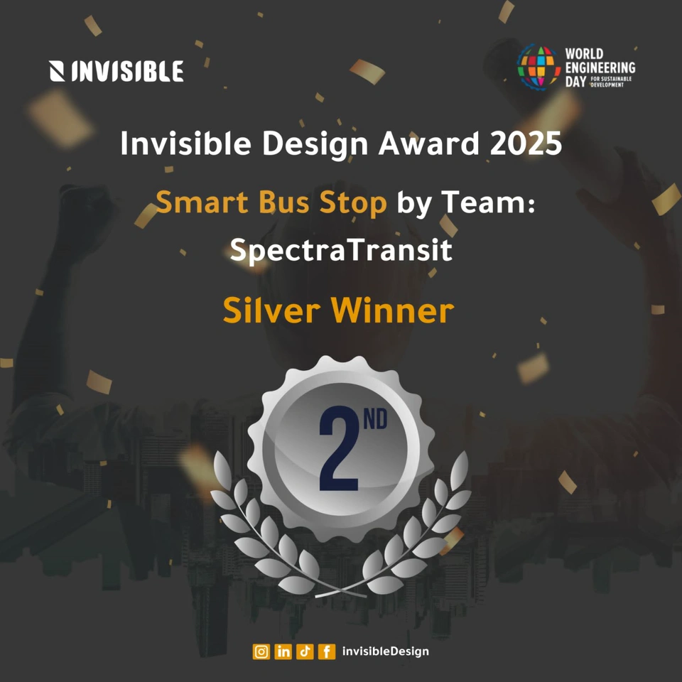 Proud to announce that SpectraTransit Team has secured 2nd place 🥈 in the Invisible Design Hackathon 2025, competing against 51 global teams. Our project, Smart Bus Stop, integrates sustainability, accessibility, and smart technology to enhance urban transit solutions.
